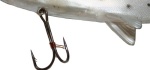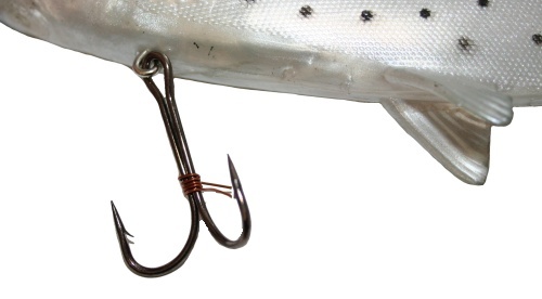 I like the fact that the Bass Harasser comes with multiple stinger hook rigging points near the adipose fin and on the belly. This configuration makes it supremely easy to add and remove your trap hooks to fit the fishing situation. Because the baits are thin from side to side, a small treble is all you need with the Bass Harasser. Look for a hook that sticks out just past the width of the body of the lure.