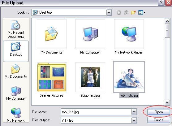 After you click Open, it will take you back to the upload window. Now that you've selected the picture, you can click on 'Upload File!' to actually load your picture up on to the calfishing.com server.