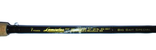 8' 15-30 7 Fast ¾ to 3 and ½ oz Fuji Alconite Concept 12 guides plus tip top The Lamiglas Big Bait Special is a rod that looks nice on the shelf. The blank is surprisingly thin, and it is just covered in the small Fuji Alconite guides. The rod has an amazing 12 guides plus the tip top on it! The action overall is pretty fluid, just a gradual taper. It's a light rod overall that feels more like a regular bass rod than a swimbait rod in your hand. With the smaller Alconite guides holding the line close the rod at close intervals, this rod pays out the line effortlessly during the cast. It really feels like the line is being sucked through the guides. I like the handle length, long enough to get back under your arm on the retrieve, and long enough to get good spacing between your hands when you need to make a long cast. This is a solid rod for smaller baits and for wood baits. If you throw a lot of 5 to 9" baits, especially the lighter wooden or hard plastic baits, this rod has a nice feel to it for that kind of stuff. You could cast the larger heavier rubber baits on this rod but it doesn't have the backbone to set the hook on a heavy piece of rubber. When I cast this rod I think Rago Rat, 5" Big Hammer, 7.5" Generic Swimbait, 9" MS Slammer or AC Plug, etc. What I don't think is 10" Stocker Trout, 12" MS Slammer, or 8" Optimum. It just doesn't have the beef in the butt section to lay into a fish on a heavy bait when the rod is already loaded up by the weight of the lure on the retrieve. Because the blank is thin, the cork handle is correspondingly thin which makes it feel small in your hand. If you want a rod that doesn't feel completely different than your normal bass rods, this would be a good choice. It's an easy transition to pick up this rod after setting down your standard 7' or 7'6" bass rod. There was one thing I did not like about this rod, and that was the wobble it gives off when casting a heavier bait. Some rods deaden quickly when flexed, and others want to continue wobbling back and forth. This rod just has a tendency to wobble after you launch the cast. It also quivers toward the middle of the blank when you rip the rod back during the retrieve. It almost feels like a glass rod in that regard. Glassy actions are good for two hook hardbaits, and smaller single hook swimbaits, but not for the heavy rubber baits or the baits with 8/0 G-Mag hooks. Buy this rod for what it is, a light, easy casting, 5 to 9" bait rod. Don't buy it expecting to heave the big stuff.