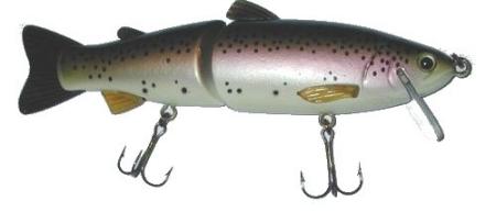 This is a super realistic / attention to detail type bait that breathes quality from the minute you pick it up. The paint jobs are attractive, consistent and durable. I got a few vertical cracks in the paint on my bait, but that was only after 4 years of sitting baking in my tackle box. This is one of the few hardbaits out there that don't really require any additional coating to maintain the paint job. The screw eyes appear to be brass and the hinges are rock solid. The bills are thick and securely mounted. I've bounced my bait off the rocks a few times (cringe!) and it's come back ok every time. I've been fishing my bait for 7 years now and it is every bit as fishable as the day I bought it. For some reason the smaller fish seem to stay away from this bait but the big ones will woof it every so often. Of the 4 or 5 bites I've had on the Castaic Hardbait, my best two fish went 13.8 and 15.4lbs and that frankly is all the evidence I need to tell me this lure is the real deal. From a collector's standpoint, this is a highly desireable lure. The original wooden Castaics routinely go for over $300 on Ebay and the Polyesterne versions are not far behind. Whether you're looking for a bait to fish with or to put on the mantle piece, this is a great lure. The main problem I had with this bait was that the fins dried out and cracked over time. It wouldn't be a problem except that you can't get replacement Castaic Hardbait fins any more since the baits are no longer in production. What I did with mine was shave down a 12" MS Slammer tail and glued it in as a replacement. With the 12" Slammer tail at it's full length, you get a very subtle but lively action out of the tail. It's not a perfect solution because shaving the tails down like that makes them weak and flimpsy but I actually think it's better than the stock tail because of the additional action. It's something to try if you have one and want to stick pigs on it rather than leave it on the mantle piece! The Castaic Hardbait Trout is no longer in production The best place to look for one would be on eBay. Special thanks to Henry Shorr for providing the pictures of the original wooden bait