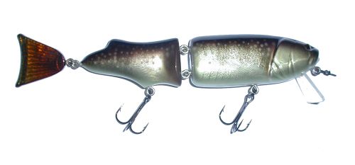 When you pick up this bait, the first thing you're going to notice is the incredible paint job. The detail on these baits is stunning. The particular one I have is kind of a brook trout pattern, and the overlays of scale pattern, parr marks, and dots is really something. It's a functional paint job with a nice clear coat over it, but when I look at it I tend to think 'collectors item' vs big fish killer.