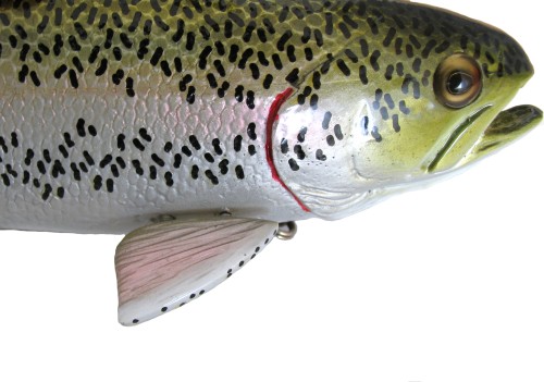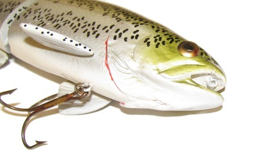 When you look at the Tool, it doesn’t really look like it would swim at all because the head is basically an exact mold of a trout’s head, but surprisingly the bait does swim back and forth with a very nice swimming action on a steady retrieve. The action isn’t a perfect trout action but because the bait is churning up the surface as it swims I really don’t think it matters much. Each Tool is hand tuned and I found that I could burn the bait to the point where it was practically jumping out of the water without causing it to run crooked. Keep in mind that this lure does not dive at all, it stays on the surface no matter what the speed. The faster the bait moves, the more the head starts to point up at you and it really is humorous to look at the lure as it’s coming toward you with its mouth open. It’s almost like a trout screaming for help as it runs.