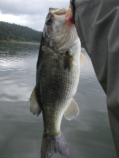 I decided to hit some other spots and pulled up on a clump of tullies. A few pitches with a senko and one runs off with it. It was a zippy 4lb 2oz fish, probably a big prespawn male. Felt good to get a bite after a slow morning of fishing. Just then these enormous raindrops start falling. Big fat rain, but just a few at a time. A few weeks earlier I had gotten soaked in a rainstorm, so I put on my rain gear and my deck boots. A few minutes later I was very glad I had done so, because it started raining like a dang monsoon. It rained so hard for 30 minutes that there was 4" of water in the bottom of my boat. The noise of the rain and the froth on the surface of the lake was incredible. I've never seen rain like that before.