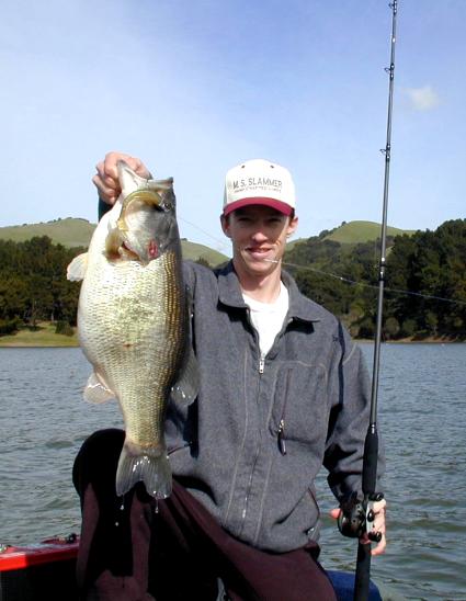 I should start this section by providing a backgrounder on the lake where I've been developing these swimbait techniques. It's Santa Margarita Lake, a small lake on the Central Coast of California. The fish are northern strain largemouth (no smallmouth or spots) and the forage consists primarily of threadfin shad, crawdads, frogs, rainbow trout, bluegill, and golden shiners. It's the shiners that I believe the swimbait is representing. The ones I've seen have been from 3 to 8 inches in length and look a lot like a sardine. The lake experiences heavy weed growth in the summer time consisting of leafy brown weeds on the bank and grass on the outside. There are some tullies but they don't dominate the shoreline and while there is some timber at high water, once the lake gets down a little ways there is very little save for the old river channel. There are four basic scenarios where I've found the swimbait to be effective: 1. During mid-summer the grass beds began forming up solidly and had a distinct outer edge. In the middle of the day the fish would hunker down there in 12-18 feet of water. It was tough to reach them with crankbaits because of the amount of grass and worming was equally frustrating, as you would be pulling grass off your bait on every cast. The swimbait presented an excellent solution. I would line up parallel casts along the outer grass lines and swim the bait slowly over the grass. Unlike a crankbait, which would either be stuck in the grass right away or only be in the strike zone for a few feet before it started coming up, I could fish the swimbait across 50 to 100 foot stretches holding it at a nearly constant depth over the weeds. Since the hook is on top of the bait, it actually slides over the grass pretty good if you do drag it too deep. A steady wind from the moment the bait splashes down is most effective in this, and pretty much every other situation. The bites were pretty subtle during this time of year. The fish would either inhale it causing your line to go slack momentarily, hit it and turn to the side, or the most frustrating bite where you'd get a tap tap tap tap and then MAYBE a solid thunk. What you learn to do is just keep reeling on these tap tap bites. The fish will usually keep hitting it until they get it. If you set on the first tap, forget about it, it's just the fish yanking on the tail. You do want to set hard on any indication that your line has gone slack though. These are usually the better fish that have the authority to inhale a 5 inch bait, and they can spit it just as quick as they can inhale it. 2. Fishing one evening on some vertical walls I discovered another application for the swimbait. My partner was worming with little success when I tied on a 5" big hammer. I flipped the bait up to the walls and let it flutter down with the reel in free spool. A few casts later it was on! The fish suspending on the walls couldn't resist the flutter of the swimbait tail. By then end of the night (an hour and 7 fish later) my partner was about ready to throw me in the water, but he was sold on the swimbait. One important thing to keep in mind here is that you never ever want to use the rod to impart action to a swimbait. Any action you impart should be done using the reel. When my bait would hit on the wall or at it's base, I just flipped the reel in to gear and started winding. Lifting your rod tip means at some point you have to lower it, creating slack and causing you to lose touch with the bait. Bad idea because if the fish grabs it, you're likely to get an awkward hookset and farm him! 3. Another interesting application of the swimbait hit me one day as my friend Matt Peters and I were cranking some submerged stickups in the old river channel. Matt located the old willow trees with his deep diving crank in otherwise open water and we followed the channel for a quarter mile or so. The cranks kept getting hung in the rotting willow trees but the swimbait fluttered right over them and produced three nice fish for us that first day. It was similar to fishing the outside of the grass beds in that you could keep the bait at the right depth for a long period of time without getting caught up in the structure. Something to think about if you ever come across this type of structure on your home waters. 4. As the water cooled in the fall, the fish became more active and moved up onto main lake flats where the weed beds were breaking up into loose clumps of grass and weeds in 6-14 feet of water. I think the fish were feeding on bluegill in these areas and the swimbait tail really seems to mimic this well despite the fact that the bait is not nearly as deep bodied as a bluegill. From the fish's perspective (underneath) though it probably looks just about right. I used a faster retrieve here partially because the water was shallower but also because the fish were more aggressive. I also threw a slightly larger Cardiffplastics bait in rainbow trout on their 7/8oz head. The bites were pretty aggressive compared to the summer time fish and they were really doing the grab it and swim at you thing where the line would just jump or slack up. Time to swing that long rod and rip some lips!