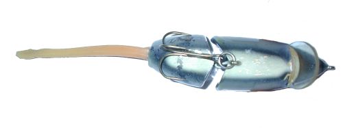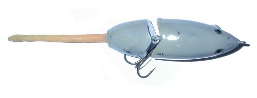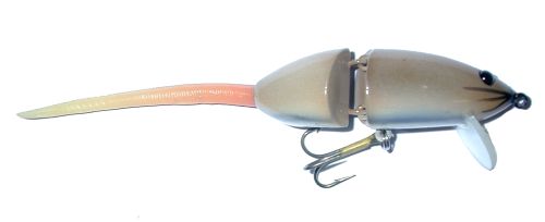 The Rago rat was debuted after many years of secrecy in the fall of 2002. The original baits were wood, but the production baits now are synthetic. The baits are very light and buoyant and use a Crème worm for the tail section. The rat measures 8" total lenth (4 and ¼" for the body) and come stock with a VMC hook. The Rago Mouse came out in late 2003. The mouse is 6 and ¾" total length.