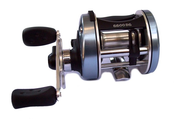 Introduced in 2005, the Abu Garcia D6 6600 adds a light, compact, and high-speed round reel to their freshwater line-up. The D6 diverges from the classic Ambassadeur series with several new features. These include the SmartMag brake system, which combines the spool tension with a magnetic brake. The reel's exterior frame was also redesigned. It is lightweight, weighing in at only 9.3oz, and compact without any of the sharp edges you see on the C3/C4 series. The reel features a high-speed 6.3:1 ratio, powered by a vented soft-paddle handle. Other features include 6 bearings, a clicker, and a disengaging level wind.