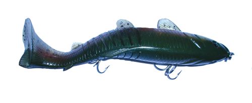 The Megabait Charlie Sr. came out in the summer of 2003. You can tell, looking at the head of the bait that it's origin is the Original Megabait Charlie, but about half way back things get a lot different. There is no bill, and there are 8 slits in the tail to give the bait a really wide tail kick at slow speeds. The internals of the bait are very interesting. There is a hard plastic head with two hook harnesses coming off of it, and the entire rigging is then covered in soft plastic. You get a continuity of color on the outside, with the rigidity of hard plastic in the head.