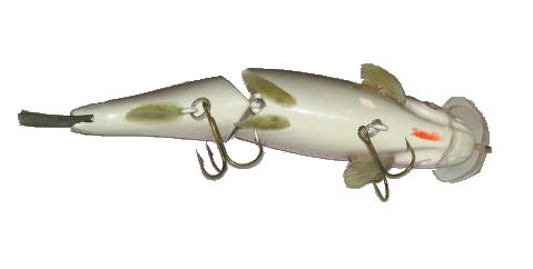 Cons: The main problem I had with this bait was that the fins dried out and cracked over time. It wouldn't be a problem except that you can't get replacement Castaic Hardbait fins any more since the baits are no longer in production. What I did with mine was shave down a 12" MS Slammer tail and glued it in as a replacement. With the 12" Slammer tail at it's full length, you get a very subtle but lively action out of the tail. It's not a perfect solution because shaving the tails down like that makes them weak and flimpsy but I actually think it's better than the stock tail because of the additional action. It's something to try if you have one and want to stick pigs on it rather than leave it on the mantle piece!