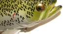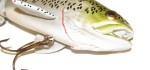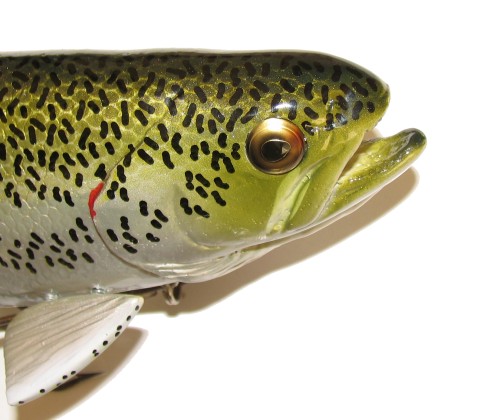 When you look at the Tool, it doesn’t really look like it would swim at all because the head is basically an exact mold of a trout’s head, but surprisingly the bait does swim back and forth with a very nice swimming action on a steady retrieve. The action isn’t a perfect trout action but because the bait is churning up the surface as it swims I really don’t think it matters much. Each Tool is hand tuned and I found that I could burn the bait to the point where it was practically jumping out of the water without causing it to run crooked. Keep in mind that this lure does not dive at all, it stays on the surface no matter what the speed. The faster the bait moves, the more the head starts to point up at you and it really is humorous to look at the lure as it’s coming toward you with its mouth open. It’s almost like a trout screaming for help as it runs.
